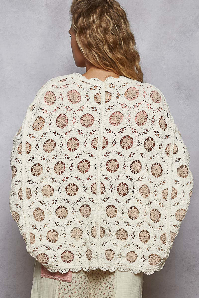 Designed in V-neck long sleeve relaxed fit cardigan in chenille with a batwing silhouette and contrasting floral pattern detailing. Cream and Latte Color. One Size Fits Most