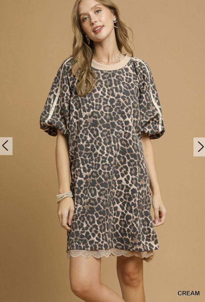 No Lining Bubble Sleeve Round Neck Animal Leopard Printed Dress