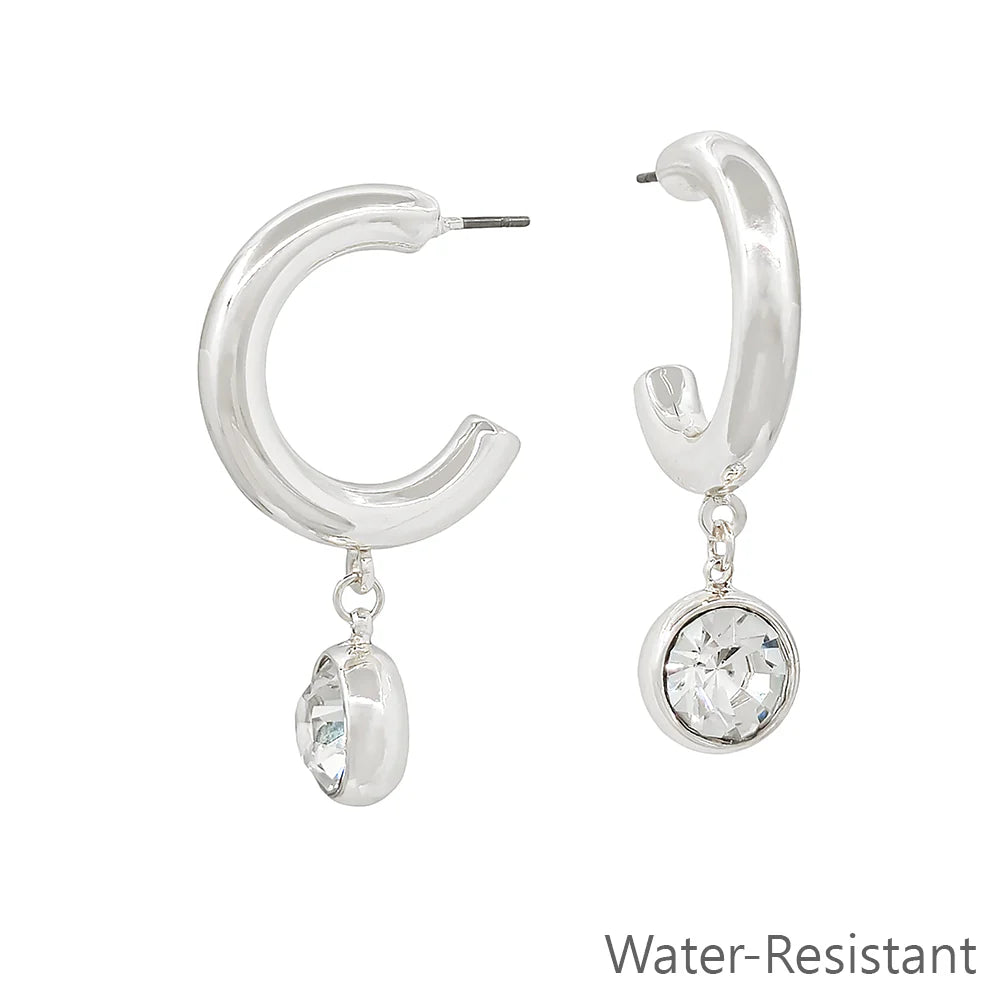 Water Resistant 1.5" Silver or Gold Hoop Earring with Circle Crystal Drop